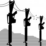 The water rights piece was drawn in pen and ink and finished in Photoshop, while the education piece was created in Corel Painter. The break in communications was entirely Illustrator.
